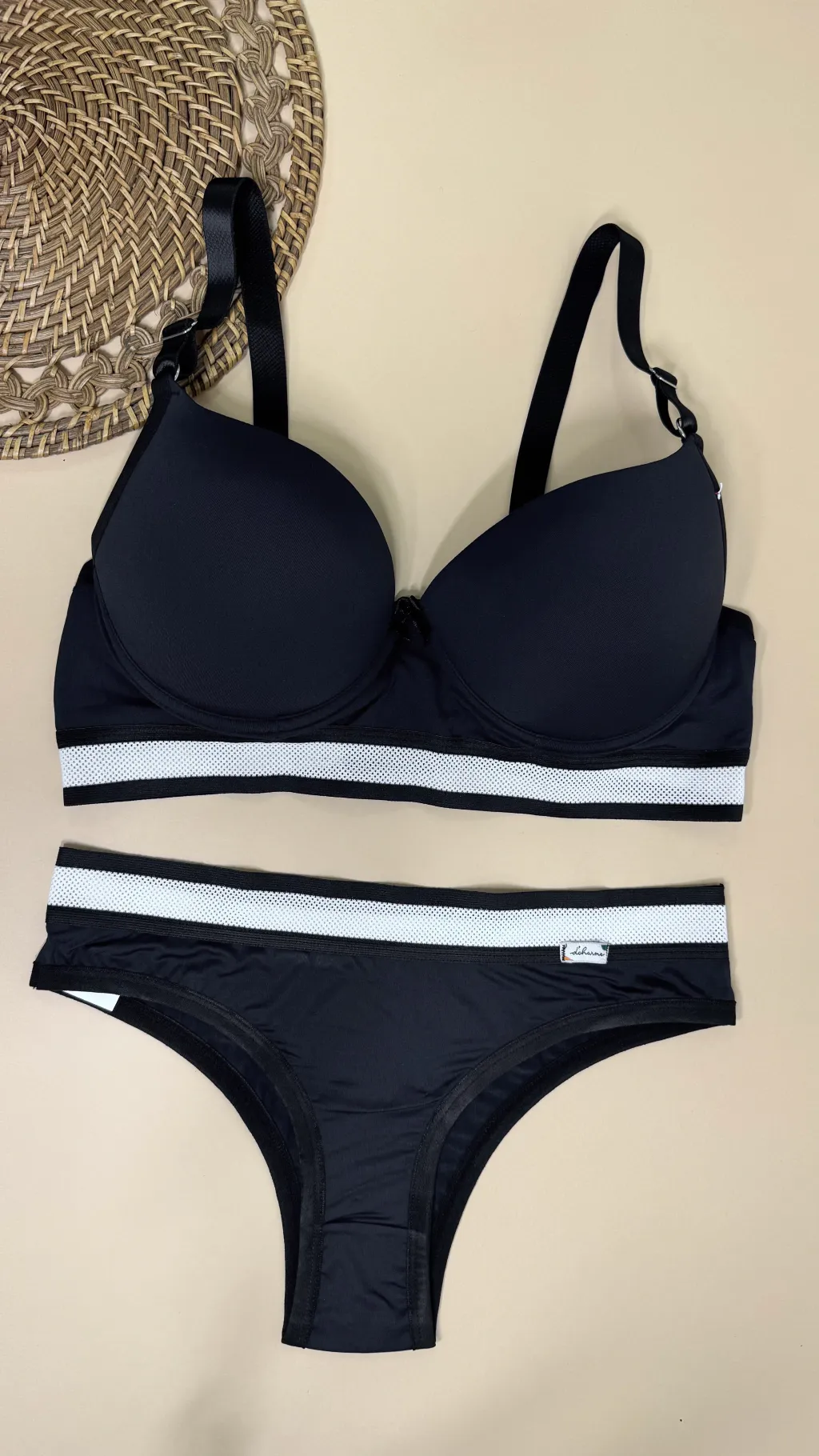 Detalhes em Contraste: O acabamento com filete colorido no cós da calcinha e no busto traz um ponto de luz e modernidade ao conjunto.
