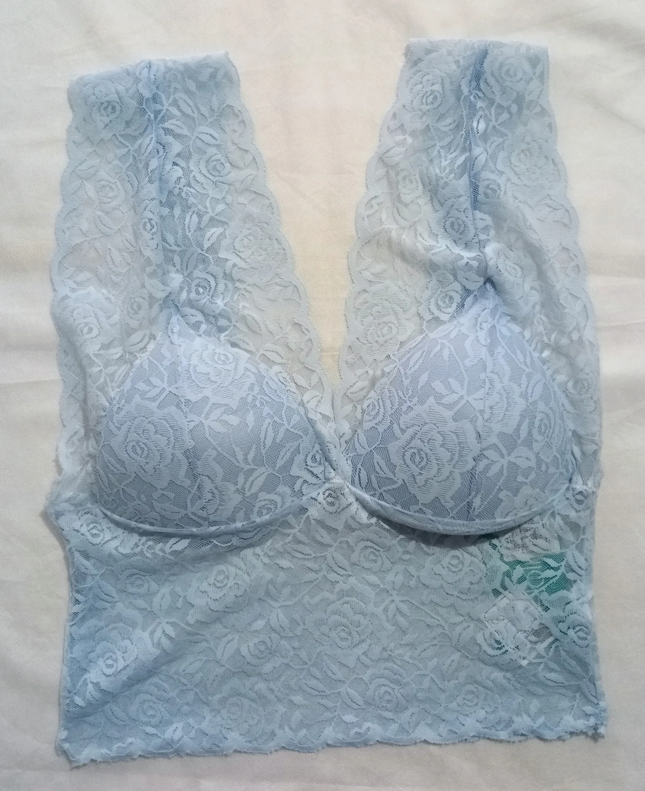 A característica principal é, sem dúvida, a renda que cobre toda a peça, desde o busto até a base alongada (a parte “cropped”). A renda em padrão floral clássico é extremamente delicada. A textura é macia ao toque.
