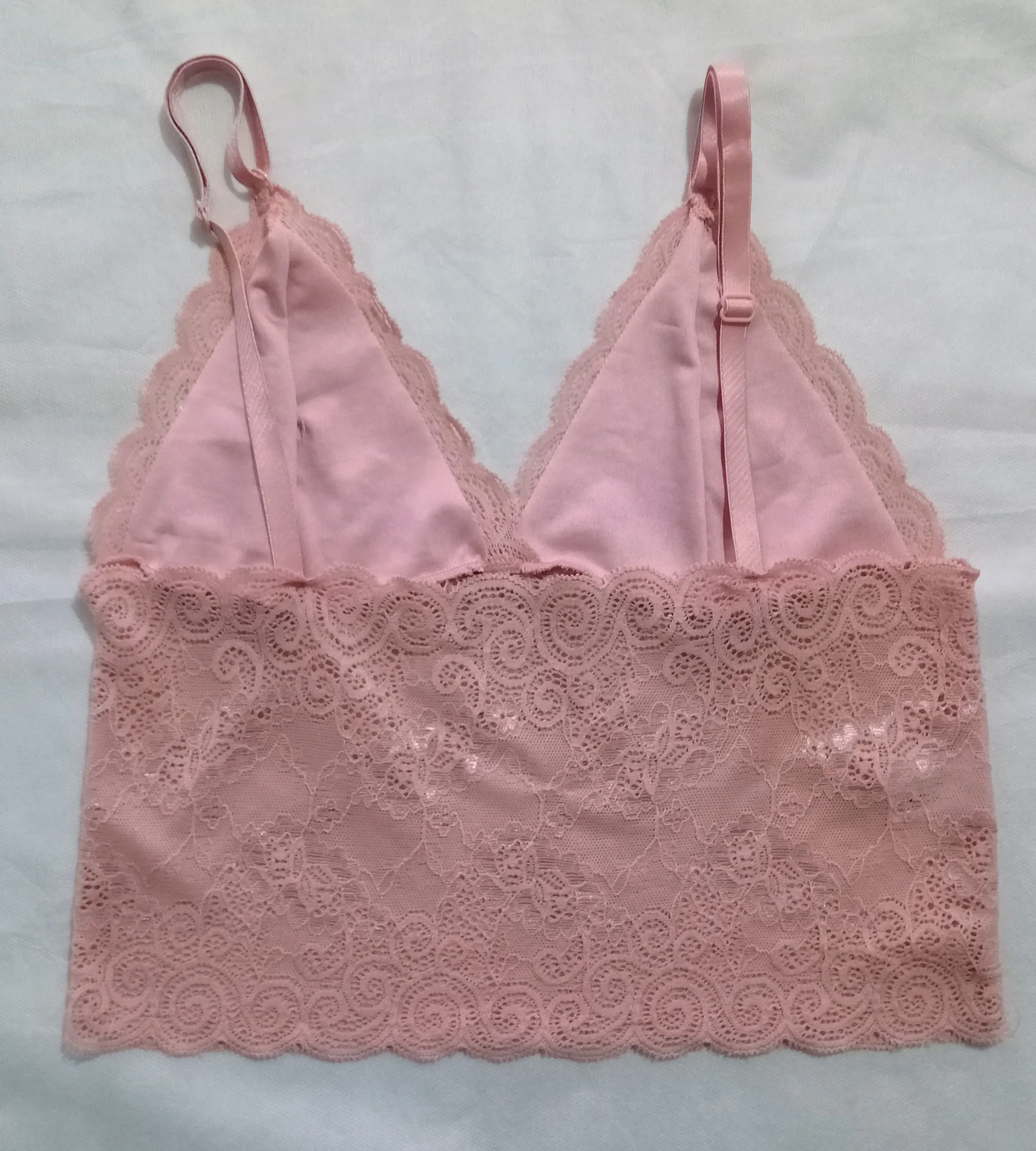 A característica principal é, sem dúvida, a renda que cobre toda a peça, desde o busto até a base alongada (a parte “cropped”). A renda em padrão floral clássico é extremamente delicada. A textura é macia ao toque.