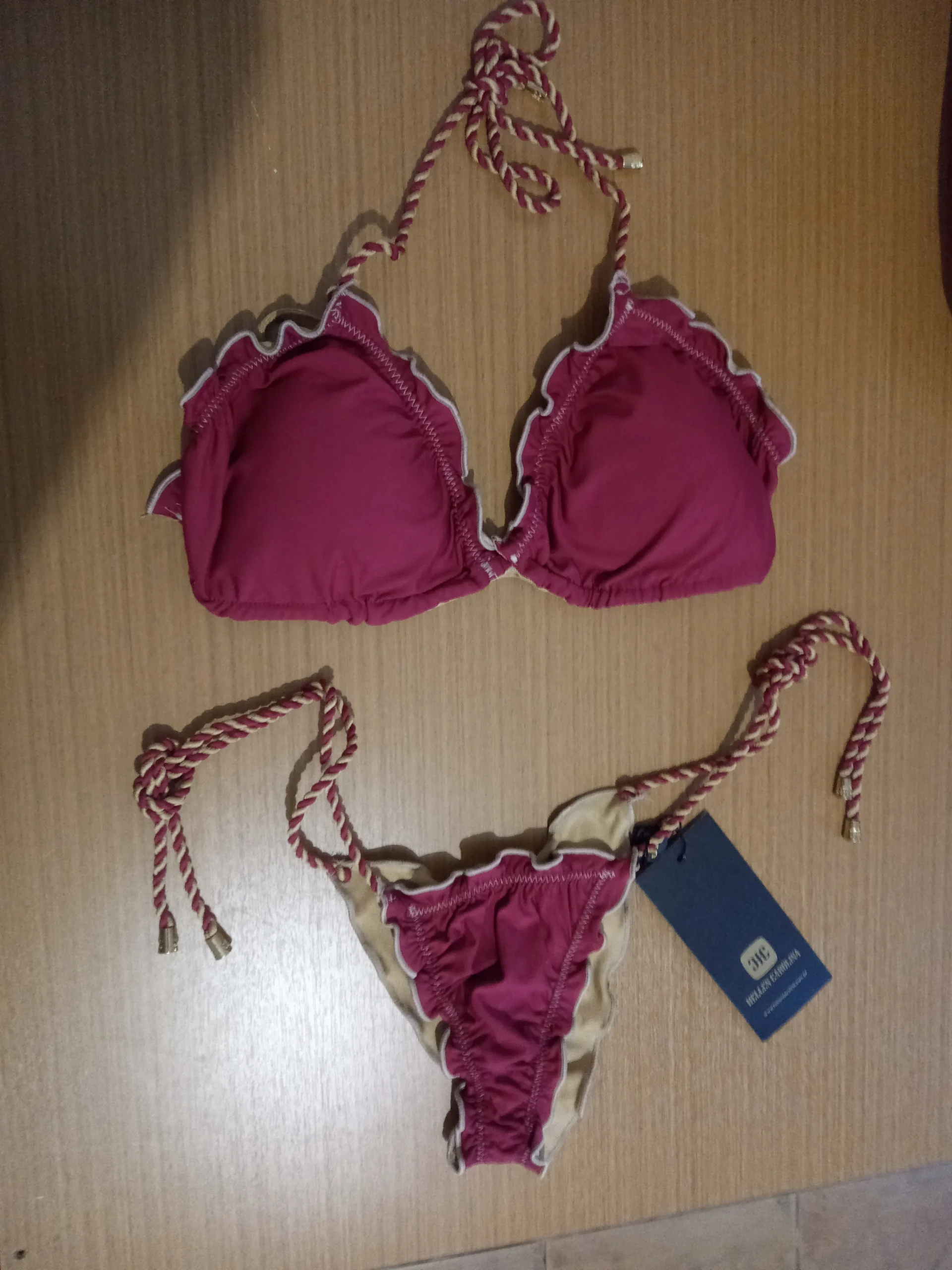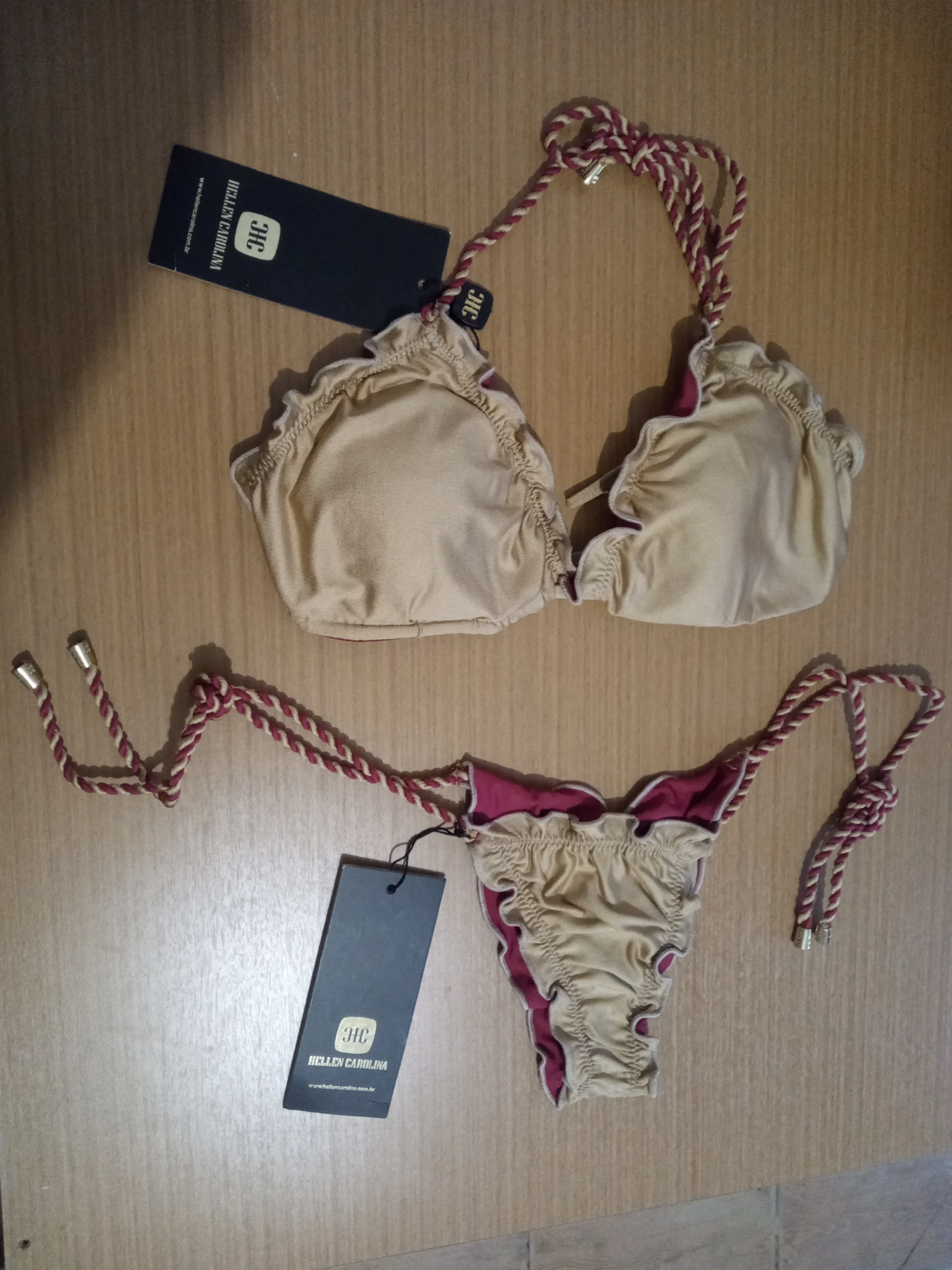 Dobre as suas opções de estilo com o nosso Biquíni Dupla Face Bordô & Gold. Este conjunto é uma obra-prima de versatilidade e sofisticação, permitindo que você alterne entre a intensidade elegante do Bordô e o brilho luxuoso do Gold (Dourado) conforme o seu humor. Uma compra inteligente para quem ama exclusividade.