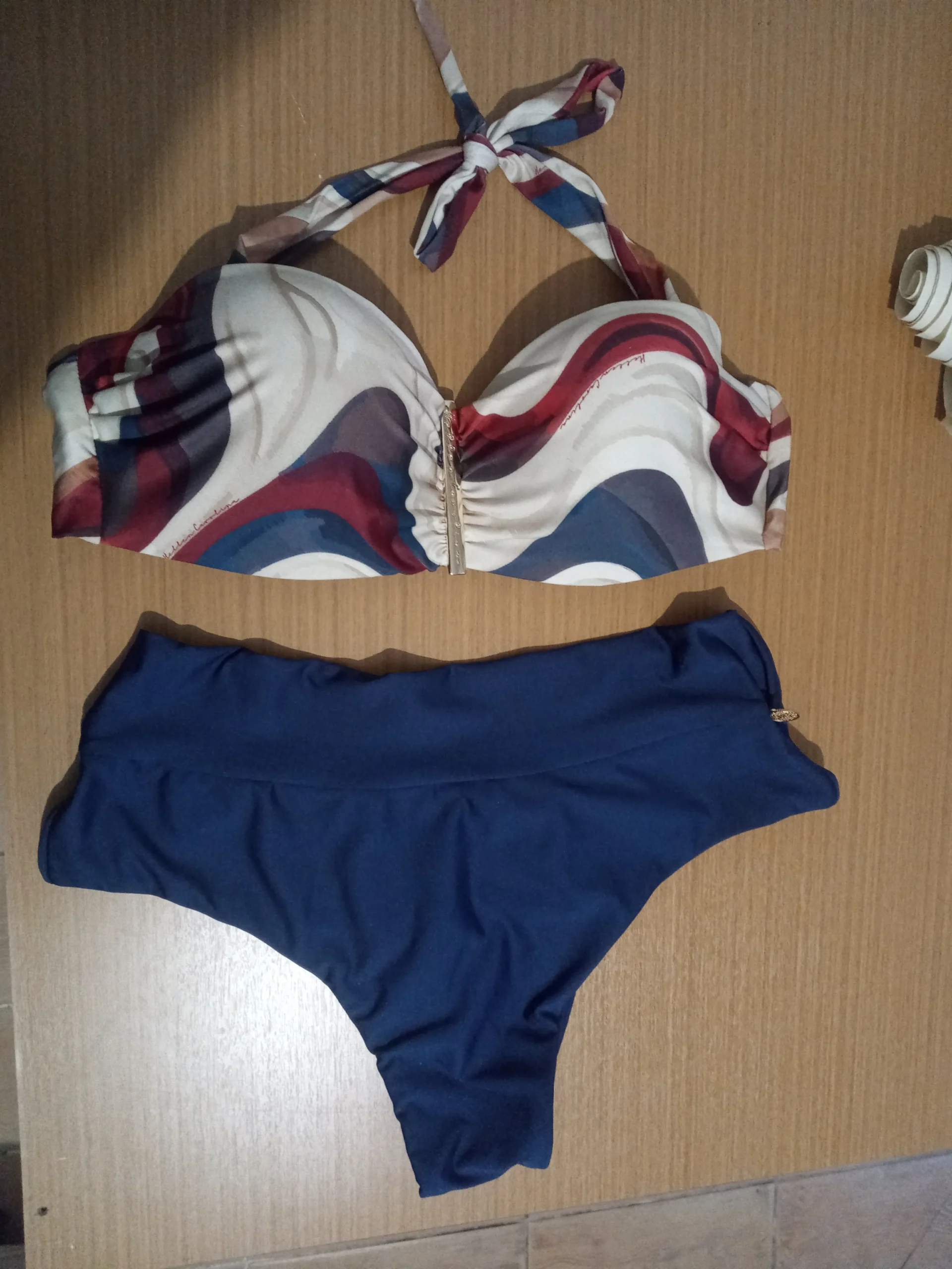 O top possui bojo estruturado e firme, projetado para modelar e sustentar o busto com total confiança. Suas alças largas garantem conforto nos ombros e amarram no pescoço e nas costas, permitindo um ajuste personalizado e seguro. O charme final fica por conta do detalhe metálico dourado central, que não oxida e cria um drapeado elegante no busto, adicionando um toque de luxo à peça.
