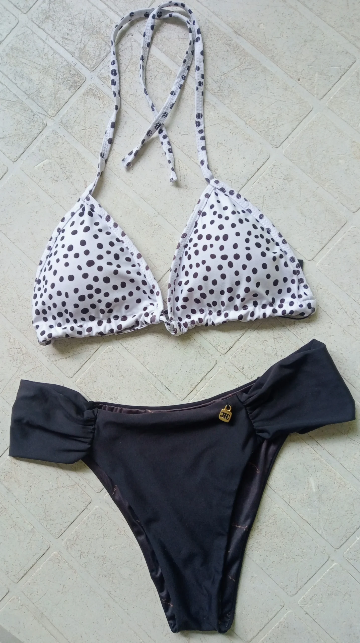 Cores: Top estampado Poá Branco e Preto / Calcinha Preta Lisa.