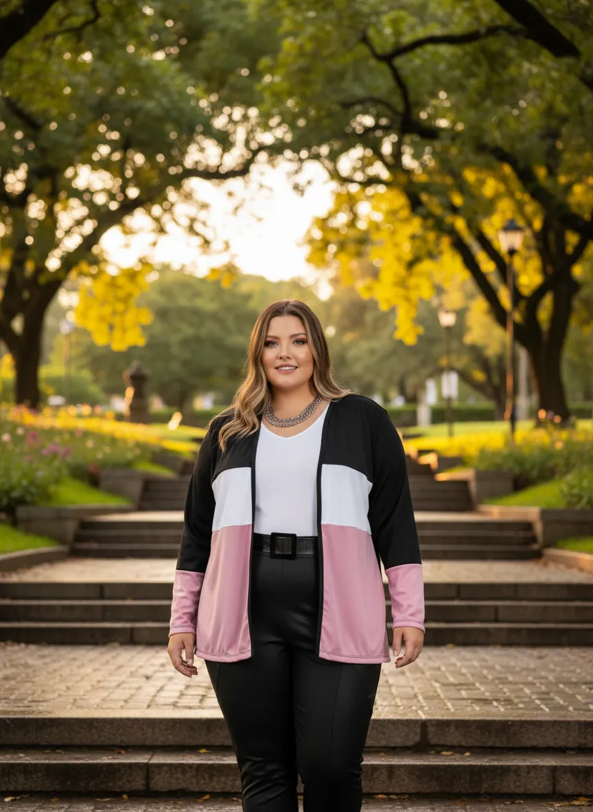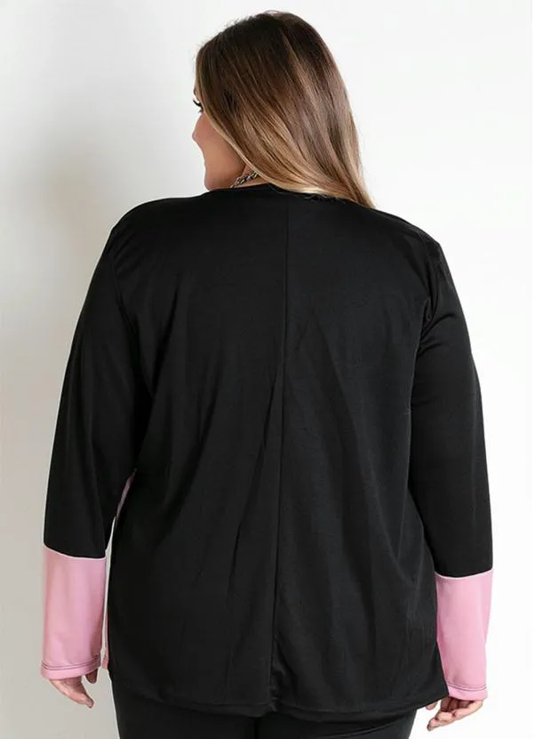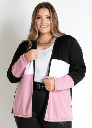 Cardigan preto e branco e rosa plus size